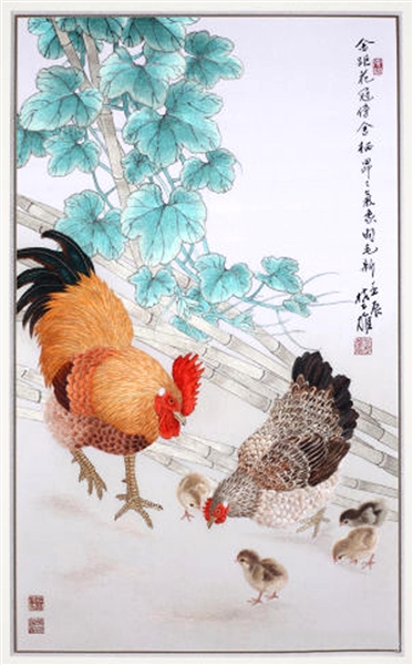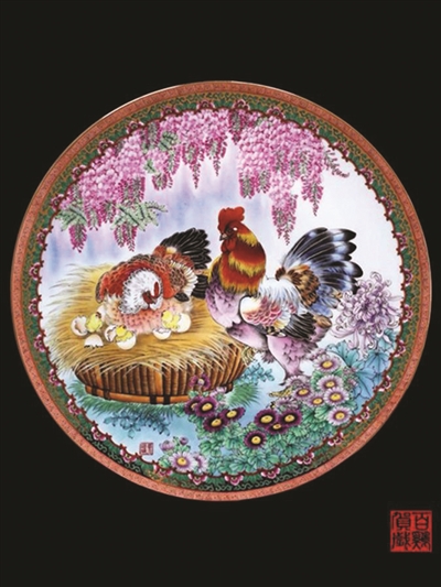 而广东省工艺美术大师翟惠玲创作的广彩作品《安居乐业》,一只雄赳赳气昂昂的雄鸡立于鸡窝旁,母鸡温情脉脉地护着一群刚破壳而出的嫩黄色小鸡,把“安居乐业”展现得淋漓尽致。