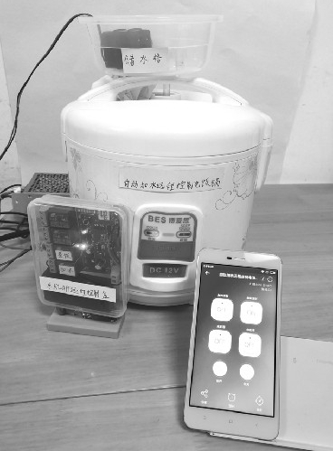 为此,从去年暑假开始,黄硕就着手“设计”一款“灵活”的电饭锅。他对市面已经有的电饭锅进行改装。“现在的电饭锅锅盖普遍都比较厚(或者可以让厂家把锅盖设计得更厚一些),故可以在锅盖里放一个储水格;或者在锅盖上直接放置一个小储水盘。等需要煮饭时,储水格的开关打开,水才进入锅体中,从而避免了煮饭前,米粒长时间浸泡在水中。同时,用市面现有的手机APP远程控制板改装,使这个控制板可以‘定时’或者‘随意’控制储水格进水开关,以及开启电饭锅的煮饭功能。”